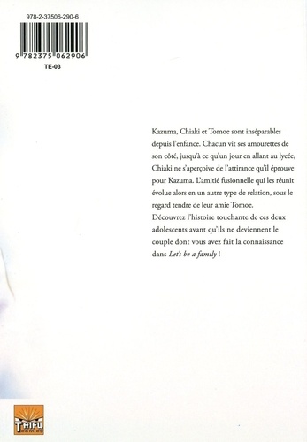 Kazuma, Chiaki et Tomoe sont inséparables depuis l'enfance. Au lycée, chacun vit ses amourettes de son côté, jusqu'à ce qu'un soir, Kazuma ne s'aperçoive de l'attirance qu'il éprouve pour Chiaki. L'amitié fusionnelle qui les réunit évolue alors en un autre type de relation sous le regard tendre de leur amie Tomoe. Découvrez l'histoire touchante de ces deux adolescents avant qu'ils ne deviennent le couple dont vous avez fait la connaissance dans Let's be a family !