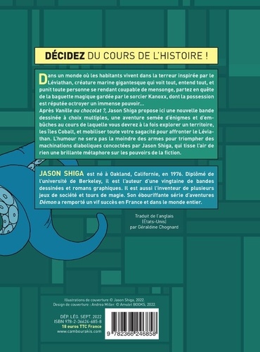 Dans un monde où les habitants vivent dans la terreur inspirée par le Léviathan, créature marine gigantesque qui voit tout, entend tout, et punit toute personne se rendant coupable de mensonge, partez en quête de la baguette magique gardée par le sorcier Kanoxx, dont la possession est réputée octroyer un immense pouvoir... Après Vanille ou chocolat ? , Jason Shiga propose ici une nouvelle bande dessinée à choix multiples, une aventure semée d'énigmes et d'embûches au cours de laquelle vous devrez à la fois explorer un territoire, les îles Cobalt, et mobiliser toute votre sagacité pour affronter le Léviathan. L'humour ne sera pas la moindre des armes pour triompher des machinations diaboliques concoctées par Jason Shiga, qui tisse l'air de rien une brillante métaphore sur les pouvoirs de la fiction.