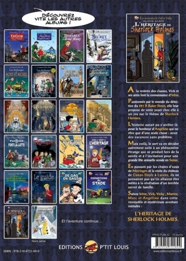 A la rentrée des classes, Vick et ses amis font la connaissance d'Irène. Passionnée par le monde du détective du 221 B Baker Street, elle leur propose de venir jouer chez elle à un jeu de "Sherlock Holmes". L'histoire aurait pu se terminer comme ça pour le bonheur d'Angélino qui ne rêve que d'une seule chose : avoir des vacances sans problème. Mais voilà, le sort va en décider autrement suite à un phénomène étrange qui se produit lors de la soirée et à l'annonce de Marc concernant une invitation pour une grande fête annuelle scoute en Suisse. En passant par les chutes d'eaux de Meiringen et la visite du château de Conan Doyle à Lucens, ils ne pensaient pas qu'ils allaient être mêlés à la révélation d'un terrible secret de famille. Emboîtez le pas d'Irène, Vick, Vicky , Marine, Marc et Angélino vers cette incroyable et mystérieuse aventure intitulée : L'HERITAGE DE SHERLOCK HOLMES.