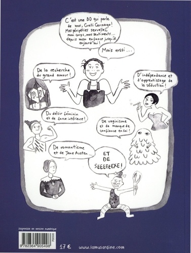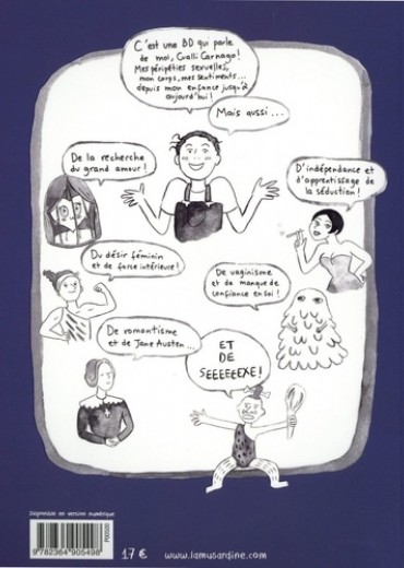 C'est une BD qui parle de moi, Cualli Carnago ! Mes péripéties sexuelles, mon corps, mes sentiments... depuis mon enfance jusqu'à aujourd'hui ! Mais aussi... De la recherche du grand amour ! D' indépendance et d'apprentissage de la séduction ! Du désir féminin et de force intérieure ! De vaginisme et de manque de confiance en soi ! De romantisme et de Jane Austen... ET DE SEEEEEEXE !