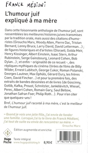 - Une foisonnante anthologie, racontée sous forme de dialogue entre l'auteur Franck Médioni et sa mère à qui il explique ce qu'est l'humour juif. - Divisée en sept chapitres, introduit par un texte drôle et didactique, traités par thèmes : Amour, Bonheur, Famille Argent, Sexe, Vieillesse ... Chaque ouverture illustrée par des dessins de Serge Bloch. Ce qui fait l'originalité de cette anthologie, c'est la présence d'extraits : de romans, de livres et de BD et de répliques de cinéma. Anthologie de l'humour Juif - l'une des plus complètes -, qui réunit les meilleures histoires juives qui se transmettent par la tradition orale, et rassemble - des citations d'humoristes (Groucho Marx, Woody Allen, S. J. Perelman...), - de figures historiques : Golda Meïr, Henry Kissinger, Einstein, Rubinstein, Serge Gainsbourg, Leonard Cohen, Bob Dylan... mais aussi - c'est l'originalité de ce livre - - des répliques de films : Billy Wilder, George Cukor, Lautner, Gérad Oury, ou les frères Coen ...) et - des extraits de romans, de BD et de livres : Proust, Ionesco, Wiesel, Perec, Gary, Saul Bellow ou Philip Roth,