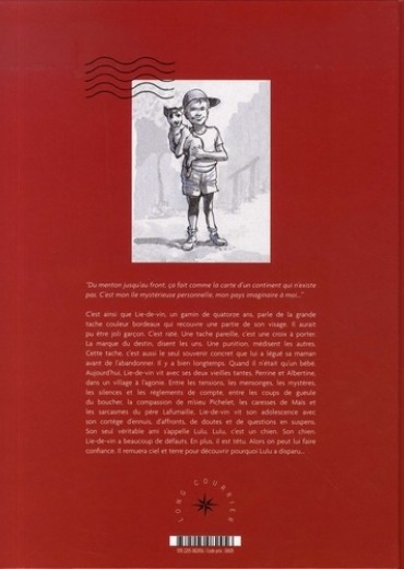 "Du menton jusqu'au front, ça fait comme la carte d'un continent qui n'existe pas. C'est mon île mystérieuse personnelle, mon pays imaginaire à moi..." C'est ainsi que Lie-de-vin, un gamin de quatorze ans, parle de la grande tache couleur bordeaux qui recouvre en partie de son visage. Il aurait pu être joli garçon. C'est raté. Une tache pareille, c'est une croix à porter. La marque du destin, disent les uns. Une punition, médisent les autres. Cette tache, c'est aussi le seul souvenir concret que lui a légué sa maman avant de l'abandonner. Il y a bien longtemps. Quand il n'était qu'un bébé. Aujourd'hui, Lie-de-vin vit avec ses deux vieilles tantes, Perrin et Albertine, dans un village à l'agonie. Entre les tensions, les mensonges, les mystères, les silences et les règlements de compte, entre les coups de gueule du boucher, la compassion de m'sieu Pichelet, les caresses de Maïs et les sarcasmes du père Lafumaille, Lie-de-vin vit son adolescence avec son cortège d'ennuis, d'affronts, de doutes et de questions en suspens. Son seul véritable ami s'appelle Lulu. Lulu, c'est un chien. Son chien. Lie-de-vina beaucoup de défauts. En plus, il est têtu. Alors on peut lui faire confiance. Il remuera ciel et terre pour découvrir pourquoi Lulu a disparu...