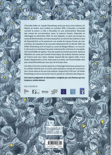 Charlotte Keller et Joseph Rosenberg, ainsi que leurs trois enfants Lili, Robert et André, sont arrêtés en octobre 1943, à Roubaix. La famille connaît la prison à Lille, à Bruxelles et une antichambre flamande des camps de concentration nazis, la caserne Dossin. Déportés en Allemagne en décembre 1943, ils sont séparés. Le père est envoyé au camp de Buchenwald, où il sera assassiné ; la mère et les enfants à celui de Ravensbrück où ils passeront une année de travaux forcés, de malnutrition, de maladies et de mauvais traitements SS. En février 1945, les Keller Rosenberg sont envoyés au camp de Bergen-Belsen, un mouroir ciel ouvert où sévissent les pires violences SS, la famine et une épidémie incontrôlée de typhus. Tous les quatre survivent pourtant Après la libération du camp par l'armée britannique, les enfants doivent rentrer en France sans leur mère, malade. Quand elle les rejoint enfin, il leur faudra réapprendre à vivre, mais aussi à se taire, car l'innommable n'est pas compréhensible par ceux qui ne l'ont pas vécu. Cet album très documenté apporte un éclairage historique puissant sur le combat insensé pour la survie, dans plusieurs camps de concentration, d'une mère et de ses trois enfants. Aujourd'hui à 93 ans, Lili Keller Rosenberg continue de porter haut la parole en mémoire des disparus. Une ouvre poignante et nécessaire, cosignée par une femme qui est, toujours, restée debout.