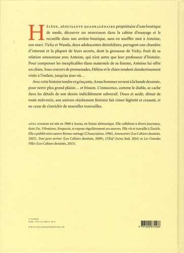 Hélène, séduisante quadragénaire propriétaire d'une boutique de mode, découvre un nourrisson dans la cabine d'essayage et le recueille dans son arrière-boutique, sans en souffler mot à Antoine, son mari. Vicky et Wanda, deux adolescentes désinhibées, partagent une chambre d'internat et la plupart de leurs secrets, dont la grossesse de Vicky, fruit de sa relation amoureuse avec Antoine, qui n'est autre que leur professeur d'histoire. Pour compenser les inexplicables élans maternels de sa femme, Antoine lui offre un chien. Sous couvert de promenades, Hélène et le chien rendent clandestinement visite à l'enfant, jusqu'au jour où... Avec cette histoire tendre et grinçante, Anna Sommer revient à la bande dessinée, pour notre plus grand plaisir... et frisson. L'innocence, comme le diable, se cache dans les détails de son dessin indiciblement subversif. Doux et acide, dénué de toute mièvrerie, son univers résolument féminin fait rimer légèreté et cruauté, et ne cesse de s'enrichir de nouvelles trouvailles.