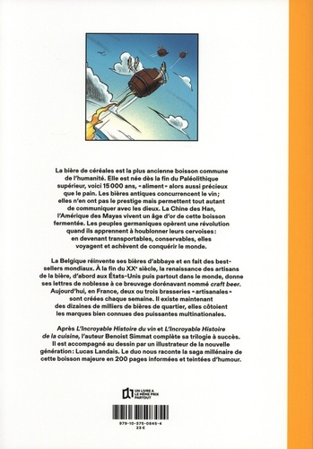 De la préhistoire à nos jours, 15 000 ans d'aventure. La bière de céréales est la plus ancienne boisson commune de l'humanité. Elle est née dès la fin du Paléolithique supérieur, voici 15 000 ans, " aliment " alors aussi précieux que le pain. Les bières antiques concurrencent le vin ; elles n'en ont pas le prestige mais permettent tout autant de communiquer avec les dieux. La Chine des Han, l'Amérique des Mayas vivent un âge d'or de cette boisson fermentée. Les peuples germaniques opèrent une révolution quand ils apprennent à houblonner leurs cervoises : en devenant transportables, conservables, elles voyagent et achèvent de conquérir le monde. La Belgique réinvente ses bières d'abbaye et en fait des best-sellers mondiaux. A la fin du XXe siècle, la renaissance des artisans de la bière, d'abord aux Etats-Unis puis partout dans le monde, donne ses lettres de noblesse à ce breuvage dorénavant nommé craft beer. Aujourd'hui, en France, deux ou trois brasseries " artisanales " sont créées chaque semaine. Il existe maintenant des dizaines de milliers de bières de quartier, elles côtoient les marques bien connues des puissantes multinationales. Après L'Incroyable Histoire du vin et L'Incroyable Histoire de la cuisine, l'auteur Benoist Simmat complète sa trilogie à succès. Il est accompagné au dessin par un illustrateur de la nouvelle génération : Lucas Landais. Le duo nous raconte la saga millénaire de cette boisson majeure en 200 pages informées et teintées d'humour.