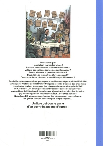 Savez-vous que : Hugo faisait tourner les tables ? Balzac a pensé devenir cultivateur d'ananas ? Voltaire appelait ses contes des couillonnades ? Pascal a inventé la première calculette ? Baudelaire se teignait les cheveux en vert ? Duras a caché un résistant nommé François Mitterrand ? Au diable statues vermoulues, perruques poussiéreuses et pourpoints défraîchis : L'Incroyable Histoire de la littérature française raconte, à travers des anecdotes truculentes, la vie et les oeuvres des plus grands auteurs français du XVIe au XXe siècle. Cet album passionnant s'adresse aussi bien aux novices qu'aux férus de littérature. Il transformera à jamais votre vision des écrivains qui, bien que géniaux, restent avant tout... des êtres humains. Quand une BD s'empare avec humour des classiques et nous présente les génies français dans leur plus simple appareil... Un livre qui donne envie d'en ouvrir beaucoup d'autres !