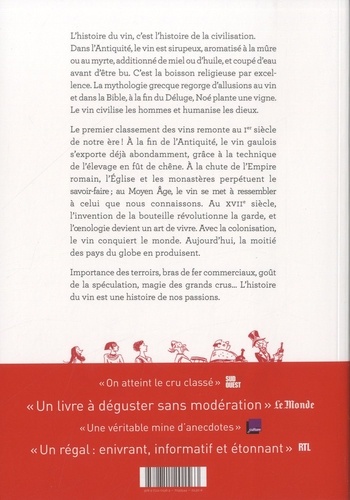 L'histoire du vin, c'est l'histoire de la civilisation. Dans l'Antiquité, le vin est sirupeux, aromatisé à la mûre ou au myrte, additionné de miel ou d'huile, et coupé d'eau avant d'être bu. C'est la boisson religieuse par excellence. La mythologie grecque regorge d'allusions au vin et dans la Bible, à la fin du Déluge, Noé plante une vigne. Le vin civilise les hommes et humanise les dieux. Le premier classement des vins remonte au Ier siècle de notre ère ! A la fin de l'Antiquité, le vin gaulois s'exporte déjà abondamment, grâce à la technique de l'élevage en fût de chêne. A la chute de l'Empire romain, l'Eglise et les monastères perpétuent le savoir-faire ; au Moyen Age, le vin se met à ressembler à celui que nous connaissons. Au XVIIe siècle, l'invention de la bouteille révolutionne la garde, et l'oenologie devient un art de vivre. Avec la colonisation, le vin conquiert le monde. Aujourd'hui, la moitié des pays du globe en produisent. Importance des terroirs, bras de fer commerciaux, goût de la spéculation, magie des grands crus... L'histoire du vin est une histoire de nos passions.