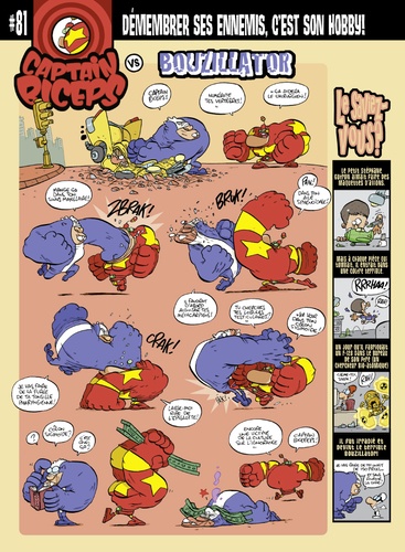 Le justicier déjanté fait son show ! Le justicier qui peut arracher les dents sans anesthésie, celui dont les os sont en acier, les muscles en béton, bref l'homme le plus fort de la planète (et même au-delà), rempile pour une nouvelle fournée de gags qui décoiffent. Son costume rouge et jaune en impose à tous ceux, super-méchants et autres maîtres du monde, qui croisent sa route. Elle n'est pas toujours droite, mais notre justicier trouve à coup sûr la pirouette pour mieux rebondir. Justicier, c'est un métier à plein temps que Captain Biceps exerce avec une foi inébranlable. L'humour est son arme la plus redoutable, celle qui met K. O. ses adversaires les plus coriaces. Petite tête et petite cervelle ne sont pas des obstacles infranchissables pour ce super-rigolo imaginé par le papa de TITEUF, Zep, illustré avec les super-dessins de Tébo.