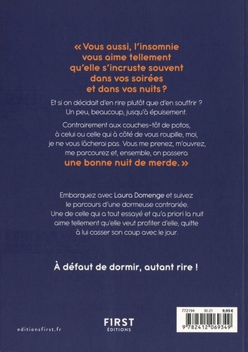 "Vous aussi, l'insomnie vous aime tellement qu'elle s'incruste souvent dans vos soirées et dans vos nuits ? Et si on décidait d'en rire plutôt que d'en souffrir ? Un peu, beaucoup, jusqu'à épuisement. Contrairement aux couches-tôt de potos, à celui ou celle qui à côté de vous roupille, moi, je ne vous lâcherai pas. Vous me prenez, m'ouvrez, me parcourez et, ensemble, on passera une bonne nuit de merde." Embarquez avec Laura Domenge et suivez le parcours d'une dormeuse contrariée. Une de celle qui a tout essayé et qu'a priori la nuit aime tellement qu'elle veut profiter d'elle, quitte à lui casser son coup avec le jour. A défaut de dormir, autant rire !