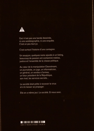 Ceci n'est pas une bande dessinée, ni une autobiographie, ni une enquête. C'est un peu tout ça. C'est surtout l'histoire d'une contagion. Un soupçon, quelques noms ajoutés à un listing, beaucoup de passion ont contaminé médias, justice et l'ensemble de la classe politique. Au coeur de la manipulation Clearstream, un journaliste, un juge, un informaticien, un général, un vendeur d'armes, un futur président de la République, son rival, les services secrets... La société était prête à recevoir le virus et à le laisser se propager. Elle en a même joui. La société. Et nous avec.