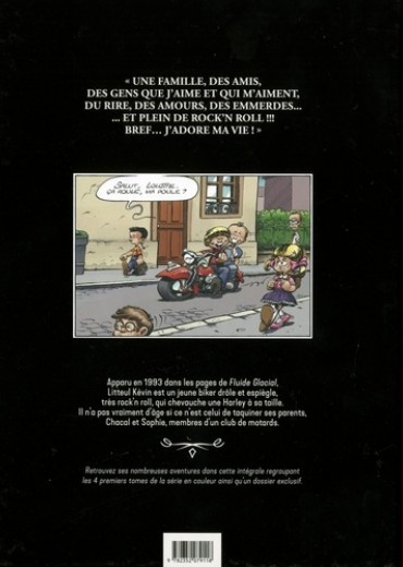 "Une famille, des amis, des gens que j'aime et qui m'aiment, du rire, des amours, des emmerdes... et plein de rock'n roll !!! Bref... j'adore ma vie ! " Apparu en 1993 dans les pages de Fluide Glacial, Litteul Kévin est un jeune biker drôle et espiègle, très rock'n roll, qui chevauche une Harley à sa taille. Il n'a pas vraiment d'âge si ce n'est celui de taquiner ses parents, Chacal et Sophie, membres d'un club de motards. Retrouvez ses nombreuses aventures dans cette intégrale regroupant les 4 premiers tomes de la série en couleur ainsi qu'un dossier exclusif.