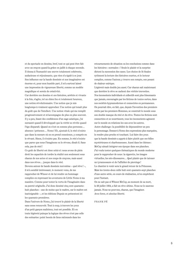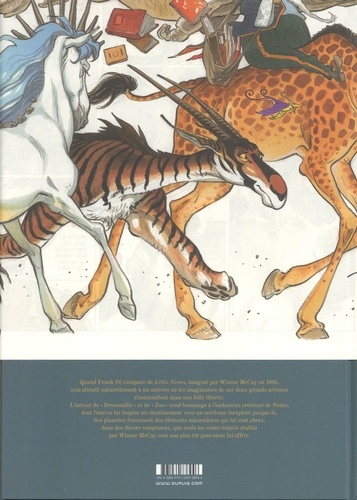 Quand Frank Pé s'empare de "Little Nemo", le petit garçon rêveur créé par Winsor McCay en 1905 pour le New York Herald, c'est pour le promener dans son imaginaire poétique et naturaliste, pour l'inviter d'un siècle à l'autre à poursuivre ses voyages oniriques à la découverte des rêves d'un autre artiste. A l'origine, ces planches ont été publiées aux éditions Toth sous forme de deux ouvrages de luxe. Elles sont nées d'un défi lancé par un galeriste à l'auteur. "Et si tu faisais tes propres pages de Little Nemo ? " Ce dernier s'est facilement laissé convaincre de replonger dans l'oeuvre révolutionnaire de Winsor McCay, le dessinateur américain qui aimait jouer des échelles et de la narration en explosant littéralement le cadre convenu de la bande dessinée. Frank Pé s'approprie cette grammaire dans un hommage magistral à la couleur directe et en grand format. Il livre alors, sous la forme d'une série de rêves traversés par ses réflexions personnelles, une véritable ode à la nature, à l'enfance, à l'innocence, à la vie.