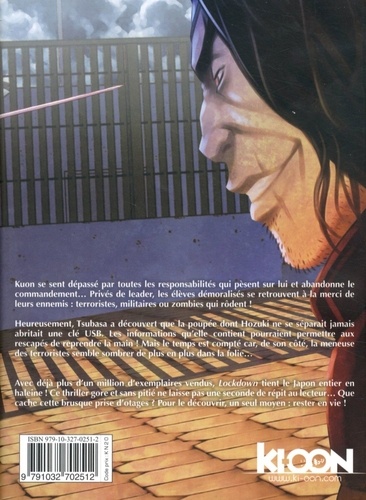 Kuon se sent dépassé par toutes les responsabilités qui pèsent sur lui et abandonne le commandement... Privés de leader, les élèves démoralisés se retrouvent à la merci de leurs ennemis : terroristes, militaires ou zombies qui rôdent ! Heureusement, Tsubasa a découvert que la poupée dont Hozuki ne se séparait jamais abritait une clé USB. Les informations qu'elle contient pourraient permettre aux réscapés de reprendre la main ! Mais le temps est compté car, de son côté, la meneuse des terroristes semble sombrer de plus en plus dans la folie... Avec déjà plus d'un millins d'exemplaires vendus, Lockdown tient le Japon entier en haleine ! The thriller gore et sans pitié ne laisse pas une seconde de répit au lecteur... Que cache cette brusque prise d'otages ? Pour le découvrir, un seul moyen : rester en vie !