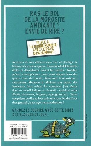 Amateurs de rire, délectez-vous avec ce florilège de blagues et jeux en tout genre. Pas moins de 400 histoires drôles et désopilantes variant les plaisirs : blondes, prêtres, contrepèteries, mais aussi adages issus des quatre coins du monde, définitions humoristiques, calembours, Monsieur & Madame pas piqués des hannetons. Sans oublier les nombreux jeux réunis dans ce recueil ludique et récréatif : sudokus, mots fléchés, devinettes, énigmes, cryptogrammes... Toute une palette de distractions qui saura vous dérider. Fous rires garantis, à partager sans modération !