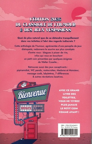 Vous manquez de distractions dans vos moments de recueillement ? Fou rire garanti avec le pavé des WC : L'officiel des toilettes 2026 ! Vous ne verrez jamais plus "le petit coin' comme avant. Quoi de plus naturel que de se détendre tranquillement dans vos toilettes à l'abri des regards indiscrets ? Cette anthologie de l'humour vespasien, agrémentée d'une panoplie de jeux distrayants, redonnera le sourire aux plus constipés d'entre vous : blagues à pisser de rire, infos qui vous en bouchent un petit coin pimentées par quelques énigmes de Walter Cosette... Retrouvez aussi des jeux cacaptivants : pipiramidial, WC pendu, Motocrottes, Madame et Monsieur, message codé, labylettres, 7 différences et autres récréations laxatives. Avec ce grand livre des toilettes, vous ne vivrez plus jamais le petit coin comme avant !