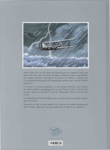 Longtemps, les experts ont cru que "L'oiseau blanc" s'était abîmé en mer, dans la Manche, puis d'autres ont estimé leur crash probable dans le Maine ou bien à Terre- Neuve... Cependant, aucun n'a pu démonter ces hypothèses. Cette bande dessinée, pertinente, une enquête digne de Sherlock Holmes, apporte de nouveaux éléments, de nouveaux témoignages... On prétend que "L'oiseau blanc" aurait- été tiré comme un pigeon ? Par qui ? Pourquoi ? Au printemps 1927, la prohibition bat son plein sur l'archipel de Saint-Pierre et Miquelon. Les eaux frontalières avec les Etats-Unis sont fréquentées par les trafiquants d'alcool qui font la navette avec la rive du Saint-Laurent. Entre Terre-Neuve et Saint-Pierre, Nungesser et Coli ont survolé les trafiquants. En cette période où les gangs se disputent le contrôle des trafics, la tension atteint son paroxysme. La présence d'Al Capone dans les parages rend ses équipes nerveuses... sans compter la présence des "Coast-Guards" Américaines dans les parages ayant reçu l'ordre d'abattre tout avions "pirate"... Bavure possible ? Treize jours plus tard, le 21 mai, le pilote Américain Charles Lindbergh réussit sa traversée de l'Atlantique à bord de son célèbre avion "Spirit Of St-Louis". Lorsqu'il se pose, il salue l'exploit des deux Français disparus. En cas de succès des Français, l'impact de la réussite de la traversée de l'Atlantique par Lindbergh sur l'industrie aéronautique américaine aurait pu être différent... Charles Nungesser et François Coli, ont été privés de leur gloire posthume...