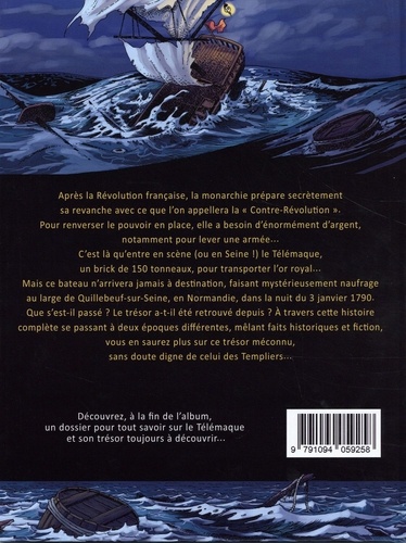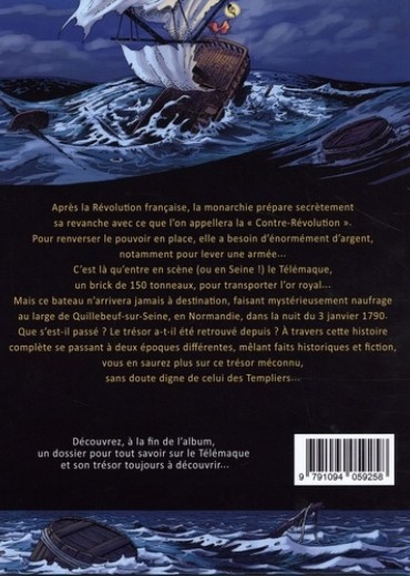 Après la Révolution française, la monarchie prépare secrètement sa revanche avec ce que l'on appellera la "Contre-Révolution". Pour renverser le pouvoir en place, elle a besoin d'énormément d'argent, notamment pour lever une armée... C'est là qu'entre en scène (ou en Seine ! ) le Télémaque, un brick de 150 tonneaux, pour transporter l'or royal... Mais ce bateau n'arrivera jamais à destination, faisant mystérieusement naufrage au large de Quillebeuf-sur-Seine, en Normandie, dans la nuit du 3 janvier 1790. Que s'est-il passé ? Le trésor a-t-il été retrouvé depuis ? A travers cette histoire complète se passant à deux époques différentes, mêlant faits historiques et fiction, vous en saurez plus sur ce trésor méconnu, sans doute digne de celui des Templiers... Découvrez, à la fin de l'album, un dossier pour tout savoir sur le Télémaque et son trésor toujours à découvrir...