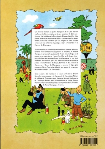 Cet album a été écrit en parler champenois de la Côte des Bar et plus particulièrement celui parlé dans le secteur de Clairvaux- Fontette (de la Vallée de la Seine jusqu'à Chateauvillain). En effet, chaque parler a ses variantes de dialecte champenois d'un département à un autre, aussi bien que d'un village à un autre tout en conservant une cohérence linguistique propre à l'ensemble de la Province de Champagne. Si chaque parler est teinté d'influences voisines (picarde, wallonne, lorraine, franc-comtoise, bourguignonne et française), le dialecte champenois présente la particularité d'avoir été une langue tout autant écrite qu'orale au Moyen-Age. Elle fut la internationale lors des fameuses Foires de Champagne et est, ainsi, richement documentée grâce aux travaux d'illustres écrivains et poètes comme Chrétien de Troyes, Bertrand de Bar, Thibaud le chansonnier - Comte de Champagne ou encore, de façon plus étonnante, Marco Polo qui a rédigé, à son retour de voyage, un récit de son périple... en champenois ! Cette version a été réalisée en se basant sur le travail d'Henri Bourcelot et des locuteurs de champenois de l'association Maison du folklore de Champagne sous l'égide de Bernard Poplineau et de Dominique Richard avec la bienveillance de Michel Tamine, Professeur honoraire de linguistique champenoise de l'Université de Reims-Champagne-Ardenne.