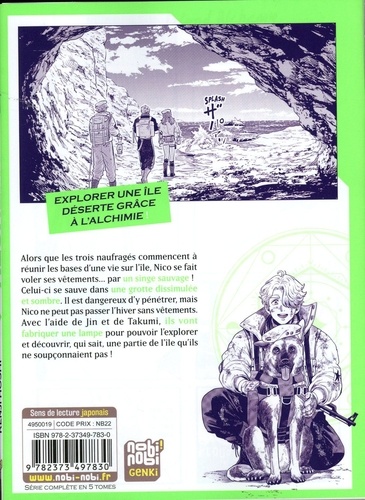 Alors que les trois naufragés commencent à réunir les bases d'une vie sur l'île, nico se fait voler ses vêtements... par un singe sauvage ! Celui-ci se sauve dans une grotte dissimulée et sombre. Il est dangereux d'y pénétrer, mais Nico ne peut pas passer l'hiver sans vêtements. Avec l'aide de Jin et de Takumi, ils vont fabriquer une lampe pour pouvoir l'explorer et découvrir, qui sait, une parti de l'île qu'ils ne soupçonnaient pas !
