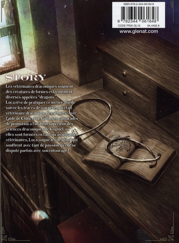Soins aux créatures magiques dans un monde garanti sans sorciers ! Les vétérinaires draconiques soignent des créatures de formes extrêmement diverses appelées "dragons". Luca rêve de pratiquer ce métier afin de suivre les traces de son père, qui était vétérinaire draconique des armées. Avec l'aide de Chloé et de Gilla, ses camarades de promotion à l'institut supérieur des sciences draconiques de Kogniel, où elles sont formées pour devenir vétérinaires, Luca soigne les dragons qui souffrent avec tant de passion qu'elle se dispute parfois avec son entourage ! Après Terrarium et ses vaisseaux à l'abandon, Yuna Hirasawa plonge dans un univers tout aussi onirique, la fantasy en plus. Une école, des dragons, des rivalités sans oublier le destin d'un parent disparu... La jeune Luca, vétérinaire draconique vous invite à un voyage d'écailles et de brise !