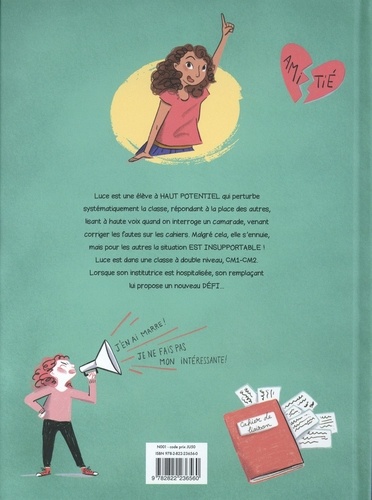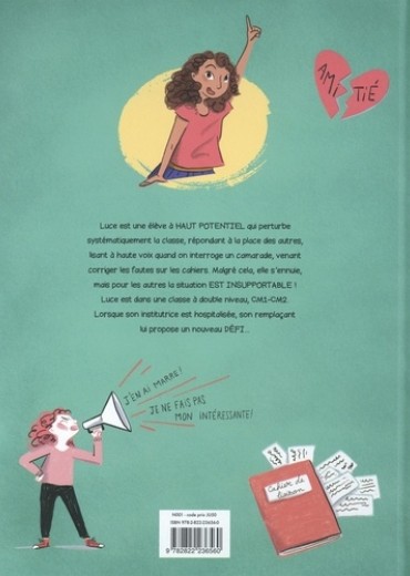 En CM1, Luce, enfant surdouée non diagnostiquée, perturbe la classe tout en ne se sentant pas à sa place. Luce est une élève A HAUT POTENTIEL qui perturbe systématiquement la classe, répondant à la place des autres, lisant à haute voix quand on interroge un camarade, venant corriger les fautes sur les cahiers. Malgré cela, elle s'ennuie, mais pour les autres la situation EST INSUPPORTABLE ! Luce est dans une classe à double niveau, CM1-CM2. Lorsque son institutrice est hospitalisée, son remplaçant lui propose un nouveau DEFI...