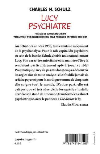 Au début des années 1950, les Peanuts se moquaient de la psychanalyse. Pour le rôle capital du psychiatre au sein de la bande, Schulz choisit tout naturellement Lucy. Son caractère autoritaire et sa manière d'être la rendaient particulièrement apte à jouer ce rôle. Pragmatique, Lucy n'a pas mis longtemps à découvrir les règles d'or de toute analyse : elle n'oublie jamais de se faire payer et pour la modique somme de cinq cents elle soigne tout le monde. D'autre part, elle est catégorique et très sûre d'elle lorsqu'elle s'installe derrière son stand de limonade, transformé en cabinet psychiatrique, avec le panneau : "The doctor is in" . Claude Moliterni