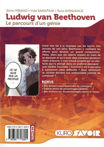 La vie passionante de Beethoven : un génie de la musique, même après avoir perdu l'ouïe ! Initié très tôt à la musique par les leçons très strictes de son père, Beethoven a multiplié les efforts pour devenir un grand compositeur. Hélas, alors que ses talents étaient en train de se déployer et qu'il avait déjà composé plusieurs chefs-d'oeuvre, il s'est trouvé accablé par un obstacle incurable qui l'a plongé dans un profond désespoir : la surdité ! Comment et pourquoi a-t-il réussi à surmonter cette difficulté ? Quel sentiment se cachait derrière son inébranlable volonté de composer ?