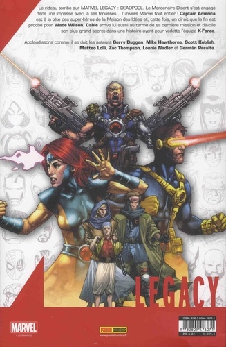 Le rideau tombe sur MARVEL LEGACY : DEADPOOL. Le Mercenaire Disert s'est engagé dans une impasse avec, à ses trousses... l'univers Marvel tout entier ! Captain America est à la tête des super-héros de la Maison des Idées et, cette fois, on dirait que la fin est proche pour Wade Wilson. Cable arrive lui aussi au terme de sa dernière mission et dévoile son plus grand secret dans une histoire ayant pour vedette l'équipe X-Force. Applaudissons comme il se doit les auteurs Gerry Duggan, Mike Hawthorne, Scott Koblish, Matteo Lolli, Zac Thompson, Lonnie Nadler et Germán Peralta.