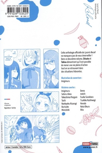 Une toute nouvelle anthologie mettant en scène nos chères Lycoris dans leur quotidien parfois mouvementé et parfois plus tranquille. Le premier chapitre et sa couverture sont dessinés par le chara-designer de l'anime, Imigimuru. Diffusé sur Crunchyroll durant l'été 2022, Lycoris Recoil a fait grand bruit dans la communauté des fans d'anime. Réalisée par A-1 Pictures, la série a immédiatement séduit le public par sa qualité d'animation, son scénario captivant et ses personnages aussi attachants que puissants. L'oeuvre a tellement eu de succès qu'un nouveau projet d'anime est prévu autour de cette licence. Lycoris Recoil - Reload est la troisième anthologie publiée par Panini Manga. Regroupant le travail de nombreux auteurs talentueux, celle-ci raconte le quotidien mouvementé de nos héroïnes. Une oeuvre qui s'inscrit dans la droite lignée de Lycoris Recoil - React et Lycoris Recoil - Repeat.