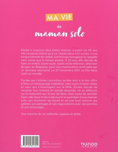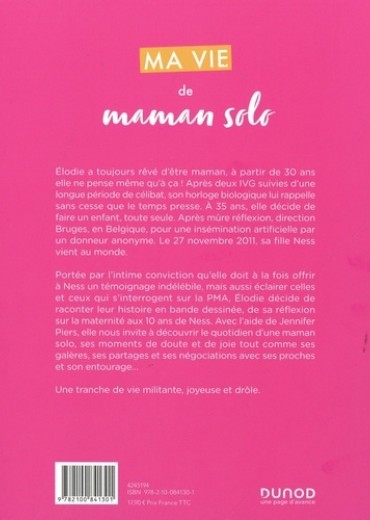 Elodie a toujours rêvé d'être maman. A partir de 30 ans, elle ne pense même qu'à ça ! Après deux IVG suivies d'une longue période de célibat, son horloge biologique lui rappelle sans cesse que le temps presse. A 35 ans, elle décide de faire un enfant, toute seule. Après mûre réflexion, direction Bruges en Belgique pour une insémination artificielle par un donneur anonyme. Le 27 novembre 2011, sa fille Ness vient au monde. Portée par l'intime conviction qu'elle doit à la fois offrir à Ness un témoignage indélébile, mais aussi éclairer celles et ceux qui s'interrogent sur la PMA, Elodie décide de raconter leur histoire en bande dessinée, de sa réflexion sur la maternité aux 10 ans de Ness. Avec l'aide de Jennifer Piers, elle nous invite à découvrir le quotidien d'une maman solo, ses moments de doute et de joie tout comme ses galères, ses partages et ses négociations avec ses proches et son entourage... Une tranche de vie militante, joyeuse et drôle.