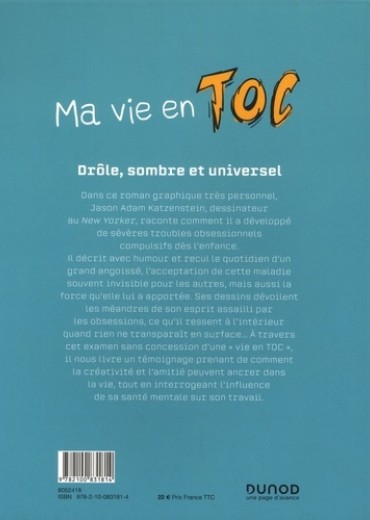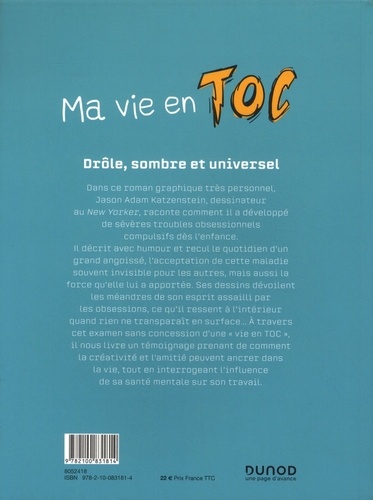 Dans ce roman graphique très personnel, Jason Adam Katzenstein, dessinateur au New Yorker, raconte comment il a développé de sévères troubles obsessionnels compulsifs dès l'enfance. Avec humour et recul, il décrit le quotidien d'un grand angoissé, l'acceptation de cette maladie souvent invisible pour les autres, mais aussi la force qu'elle lui a apportée. Ses dessins dévoilent les méandres de son esprit assailli par les obsessions, ce qu'il ressent à l'intérieur quand rien ne transparaît en surface... A travers cet examen sans concession d'une " vie en TOC " , il nous livre un témoignage prenant de comment la créativité et l'amitié peuvent ancrer dans la vie, tout en interrogeant l'influence de sa santé mentale sur son travail.