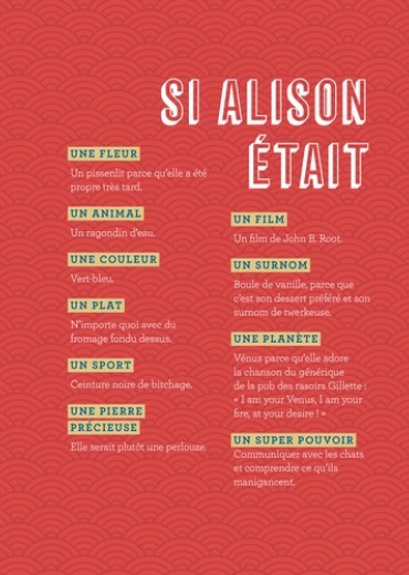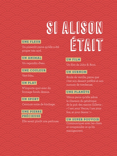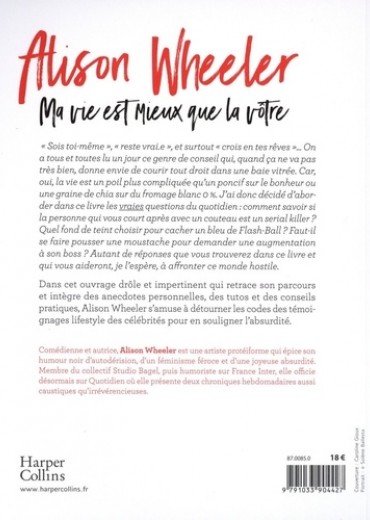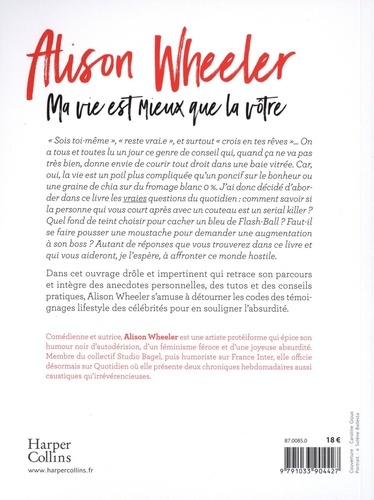 "Sois toi-même" , "reste vrai. e" , et surtout "crois en tes rêves" ... On a tous et toutes lu un jour ce genre de conseil qui, quand ça ne va pas très bien, donne envie de courir tout droit dans une baie vitrée. Car, oui, la vie est un poil plus compliquée qu'un poncif sur le bonheur ou une graine de chia sur du fromage blanc 0 %. J'ai donc décidé d'aborder dans ce livre les vraies questions du quotidien : comment savoir si la personne qui vous court après avec un couteau est un serial killer ? Quel fond de teint choisir pour cacher un bleu de Flash-Ball ? Faut-il se faire pousser une moustache pour demander une augmentation à son boss ? Autant de réponses que vous trouverez dans ce livre et qui vous aideront, je l'espère, à affronter ce monde hostile. Dans cet ouvrage drôle et impertinent qui retrace son parcours et intègre des anecdotes personnelles, des tutos et des conseils pratiques, Alison Wheeler s'amuse à détourner les codes des témoignages lifestyle des célébrités pour en souligner l'absurdité. Comédienne et autrice, Alison Wheeler est une artiste protéiforme qui épice son humour noir d'autodérision, d'un féminisme féroce et d'une joyeuse absurdité. Membre du collectif Studio Bagel, puis humoriste sur France Inter, elle officie désormais sur Quotidien où elle présente deux chroniques hebdomadaires aussi caustiques qu'irrévérencieuses. "Elle est de loin l'humoriste la plus talentueuse du PAF. La preuve, elle dure. A 33 ans, Alison Wheeler est au top. Le moment idéal, donc, pour sortir Ma vie est mieux que la vôtre, un faux guide de coaching hilarant". CAUSETTE "L'anti-guide de la femme idéale" GALA "Humoriste bien trash du Quotidien, Alison Wheeler enfonce le cou dans Ma vie est mieux que la vôtre. Tutos et conseils absurdes, féminisme féroce... Une premier livre délicieusement irrévérencieux". GRAZIA "Ses pastilles d'humour ravageur font mouche chez Yann Barthès. Elle ose même nous donner des conseils bien-être en publiant Ma vie est mieux que la vôtre". PARIS MATCH "Marre des livres bien-être et des tutos pratiques pour améliorer votre quotidien ? Précipitez-vous sur son livre, où elle détourne les codes des témoignages lifestyle pour mieux en souligner l'absurdité". TELE 7 JOURS "Un antiguide savoureux pour répondre aux questions les plus importantes de l'existence, telles que "l'homme qui vous court après avec un couteau est-il un serial killer ? " " FRANCE DIMANCHE "Dotée d'un irrésistible second degré, elle allume les injonctions faites aux femmes dans Ma vie est mieux que la vôtre, son faux guide de coaching" LE FIGARO