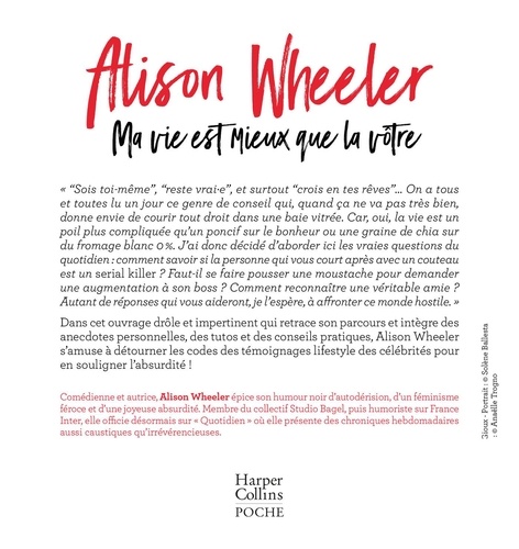 "Sois toi-même", "reste vrai-e", et surtout "crois en tes rêves"... On a tous et toutes lu un jour ce genre de conseil qui, quand ça ne va pas très bien, donne envie de courir tout droit dans une baie vitrée. Car, oui, la vie est un poil plus compliquée qu'un poncif sur le bonheur ou une graine de chia sur du fromage blanc 0 %. J'ai donc décidé d'aborder ici les vraies questions du quotidien : comment savoir si la personne qui vous court après avec un couteau est un serial killer ? Faut-il se faire pousser une moustache pour demander une augmentation à son boss ? Comment reconnaître une véritable amie ? Autant de réponses qui vous aideront, je l'espère, à affronter ce monde hostile." Dans cet ouvrage drôle et impertinent qui retrace son parcours et intègre des anecdotes personnelles, des tutos et des conseils pratiques, Alison Wheeler s'amuse à détourner les codes des témoignages lifestyle des célébrités pour en souligner l'absurdité !