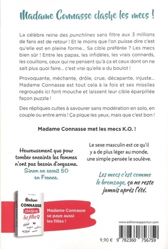 La célèbre reine des punchlines sans filtre aux 3 millions de fans est de retour ! Et le moins que l'on puisse dire c'est qu'elle est en pleine forme... Sa cible préférée ? Les mecs bien sûr ! Entre les papas, les infidèles, les vrais connards, les couillons, ceux qui ne pensent qu'à ça et ceux dont on ne sait plus quoi faire... c'est vrai qu'elle a du boulot ! Provoquante, méchante, drôle, crue, décapante, injuste... Madame Connasse est tout cela à la fois et ses missiles regroupés ici font mouche et laissent leur cible éparpillée façon puzzle ! Des répliques cultes à savourer sans modération en solo, en couple ou entre amis ! Ca pique les yeux, mais que c'est bon ! Madame Connasse met les mecs K.O. !