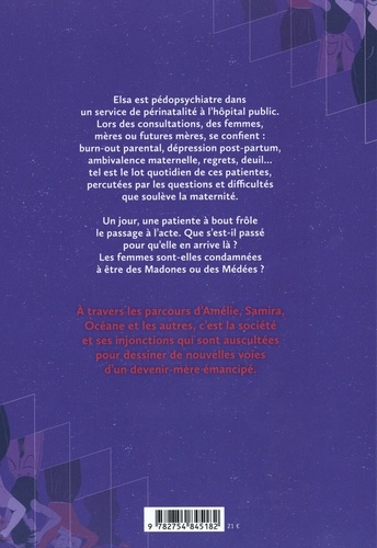 Elsa est pédopsychiatre dans un service de périnatalité à l'hôpital public. Lors des consultations, des femmes, mères ou futures mères, se confient : burn-out parental, dépression post-partum, ambivalence maternelle, regrets, deuil... tel est le lot quotidien de ces patientes, percutées par les questions et difficultés que soulève la maternité. Un jour, une patiente à bout frôle le passage à l'acte. Que s'est-il passé pour qu'elle en arrive là ? Les femmes sont-elles condamnées à être des Madones ou des Médées ? A travers les parcours d'Amélie, Samira, Océane et les autres, c'est la société et ses injonctions qui sont auscultées pour dessiner de nouvelles voies d'un devenir-mère émancipé.