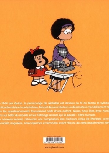 " Je ne suis pas une femme à votre disposition". Elle ne sait pas lire mais observe le chaos du monde en posant les bonnes questions. Mafalda exprime avec naïveté, douceur et humour des idées tranchantes, nettes et justes. Avec ses yeux enfantins, elle souligne les paradoxes et les faiblesses de nos sociétés et déploie des idées sincères, belles et simples. Dans son oeuvre mythique, Quino est parvenu à créer un personnage vivant dont l'influence a dépassé le créateur. En avance sur son temps, il a su comprendre la force d'un personnage principal féminin et l'a muée en symbole d'un esprit contestataire et anticonformiste. Dans ce nouveau recueil, retrouvez une compilation des meilleurs strips de Mafalda consacrés à la personnalité émancipatrice et féministe de Mafalda.