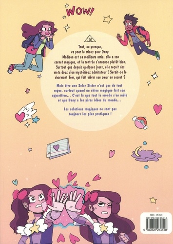 Tout, ou presque, va pour le mieux pour Deny. Madison est sa meilleure amie, elle a son carnet magique, et la rentrée s'annonce plutôt bien. Surtout que depuis quelques jours, elle reçoit des mots doux d'un mystérieux admirateur ! Serait-ce le charmant Tom, qui fait vibrer son coeur en secret ? Mais être une Solar Sister n'est pas de tout repos, surtout quand un chien magique fait son apparition... C'est là que tout le monde s'en mêle et que Dany a les pires idées du monde... Les solutions magiques ne sont pas toujours les plus pratiques !