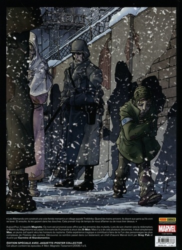 "Les Allemands ont construit une voie ferrée menant à un village appelé Treblinka. Quand les trains arrivent, ils disent aux gens qu'ils vont se laver. Et ensuite, ils les gazent dans les douches. Cela prenait trop de temps de nous affamer ou de nous tirer dessus." Aujourd'hui, il s'appelle Magneto. Ce nom est prononcé avec effroi par les ennemis des mutants. Lors de son chemin vers la rédemption, le Maître du Magnétisme est passé d'ennemi de l'humanité à atout des X-Men. Mais il y a de cela plusieurs décennies, il était simplement simplement Max, un jeune Juif ayant vécu les horreurs du nazisme. Cette experience tragique a contribué à faire de lui l'un des personnages les plus complexes de l'histoire des comics. Découvrez ce sombre passé dans Le testament, un chef-d'oeuvre Marvel écrit par Greg Pak et illustré par Carmine di Giandomenico.
