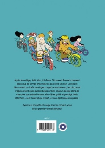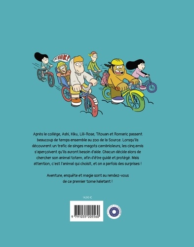 Kiku, Ashi, Lili-Rose, Titouan et Romaric, cinq amis inséparables, font une drôle de découverte dans la cour de leur collège. Le singe magot qu'ils ont trouvé les entraîne en effet sur la piste d'un trafic de singes cambrioleurs. Avec l'aide de leurs animaux totems et de leurs pouvoirs, ils vont se lancer aux trousses des malfaiteurs... Action, enquête et magie sont au rendez-vous de ce premier tome haletant.