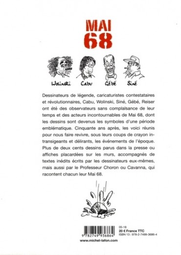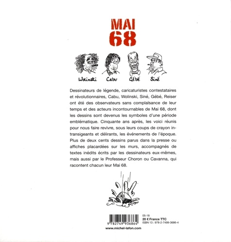 Dessinateurs de légende, caricaturistes contestataires et révolutionnaires, Cabu, Wolinski, Siné, Gébé, Reiser ont été des observateurs sans complaisance de leur temps et des acteurs incontournables de Mai 68, dont les dessins sont devenus les symboles d'une période emblématique. Cinquante ans après, les voici réunis pour nous faire revivre, sous leurs coups de crayon intransigeants et délirants, les événements de l'époque. Plus de deux cents dessins parus dans la presse ou affiches placardées sur les murs, accompagnés de textes inédits écrits par les dessinateurs eux-mêmes, mais aussi par le Professeur Choron ou Cavanna, qui racontent chacun leur Mai 68.