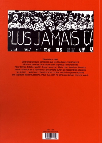 A l'hiver 1986, l'Assemblée nationale vote les lois Devaquet en vue de rendre plus sélectives les universités. Mobilisés contre cette réforme jugée discriminante, des milliers d'étudiants organisent le blocage des facs. Pendant plusieurs semaines, ils manifestent dans Paris et les face-à-face avec la police se multiplient. Au soir du 5 décembre 1986, différentes personnes vont croiser la route d'un jeune homme qui passait par hasard dans le Quartier latin : Malik Oussekine, 22 ans, un jeune homme sans histoire battu à mort par la police. Dans ce récit en noir et blanc initialement paru en 2016, Jeanne Puchol et Laurent-Frédéric Bollée reviennent sur cette tragédie qui secoua la société française et posait, déjà, la question des violences policières.