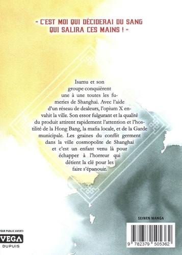 Isamu et son groupe conquièrent une à une toutes les fumeries de Shanghai. Avec l'aide d'un réseau de dealeurs, l'opium X envahit la ville. Son essor fulgurant et la qualité du produit attirent rapidement l'attention et l'hostilité de la Hong Bang, la mafia locale, et de la Garde municipale. Les graines du conflit germent dans la ville cosmopolite de Shanghai et c'est un enfant venu là pour échapper à l'horreur qui détient la clé pour les faire s'épanouir.