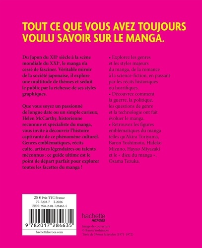 TOUT CE QUE VOUS AVEZ TOUJOURS VOULU SAVOIR SUR LE MANGA. Du Japon du XIIe siècle à la scène mondiale du XXIe, le manga n'a cessé de fasciner. Véritable miroir de la société japonaise, il explore une multitude de thèmes et séduit le public par la richesse de ses styles graphiques. Que vous soyez un passionné de longue date ou un simple curieux, Helen McCarthy, historienne reconnue et spécialiste du manga, vous invite à découvrir l'histoire captivante de ce phénomène culturel. Genres emblématiques, récits culte, artistes légendaires ou talents méconnus : ce guide ultime est le point de départ parfait pour explorer toutes les facettes du manga ! - Explorez les genres et les styles majeurs du manga, de la romance à la science-fiction, en passant par les récits historiques ou horrifiques - Découvrez comment la guerre, la politique, les questions de genre et la technologie ont fait évoluer le manga - Retrouvez les figures emblématiques du manga telles qu'Akira Toriyama, Baron Yoshimoto, Hideko Mizuno, Hayao Miyazaki et le "dieu du manga" , Osama Tezuka