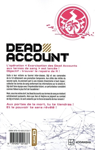 L'opération "Exorcisation des Dead Accounts aux larmes de sang" est lancée ! Objectif : trouver le repaire de K ! Suite à leur victoire au tournoi inter-classes, Sôji et ses camarades de la 1-B obtiennent une promotion temporaire. Aux cotés des initiés du second cycle, ils prennent part à une mission d'exorcisme à haut risque : collecter les larmes de sang renfermant les informations sur le sinistre K. Sôji doit faire équipe avec l'imprévisible Kutani, un perturbateur considéré comme l'élève le plus fort de l'académie ! Mais, sous les ordres de K, les Dead Accounts aux larmes de sang se révèlent extrêmement puissants. Alors que Jien et Haijima se joignent au combat de Sôji et Kutani, ils sont anéantis par la force écrasante de leur ennemi !