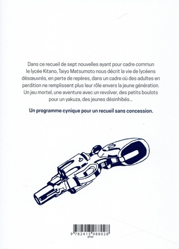 Dans ce recueil de sept nouvelles ayant pour cadre commun le lycée Kitano, Taiyo Matsumoto nous décrit la vie de lycéens désoeuvrés, en perte de repères, dans un cadre où des adultes en perdition ne remplissent plus leur rôle envers la jeune génération. Un jeu mortel, une aventure avec un revolver, des petits boulots pour un yakuza, des jeunes désinhibés... Un programme cynique pour un recueil sans concession.