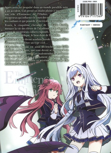 Il est prêt à tout pour devenir une Eminence de l'ombre... mais ses plus gros mensonges vont le rattraper ! Après avoir été propulsé dans un monde parallèle suite à un accident, Cid prend un malin plaisir à interpréter son rôle d'Eminence de l'Ombre, un personnage mystérieux qui influence le cours des événements depuis les coulisses et qui possède d'incroyables pouvoirs. Fenrir, le cinquième chevalier de la Table Ronde, menace la vie des élèves de l'académie en les forçant à porter de mystérieux colliers explosifs. Son but : libérer un artefact maléfique, le bras droit de Diabolos. Mais face à lui se dresse soudain Suzuki Hope, un élève discret qui rêve d'être un type cool... L'Opération Suzuki est ainsi déclenchée avec l'aide d'Alexia et de Claire, qui vont devoir se mesurer à un adversaire surpuissant ! Les malentendus et les fausses idées sur fond d'isekai s'enchaînent dans un rythme toujours plus effréné dans ce seizième volume de The Eminence in Shadow !