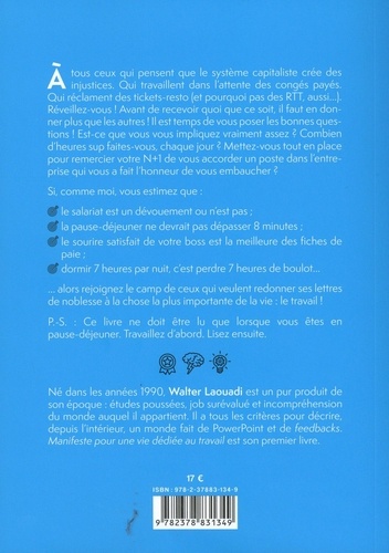 A tous ceux qui pensent que le système capitaliste crée des injustices. Qui travaillent dans l'attente des congés payés. Qui réclament des tickets-resto (et pourquoi pas des RTT, aussi...). Réveillez-vous ! Avant de recevoir quoi que ce soit, il faut en donner plus que les autres ! Il est temps de vous poser les bonnes questions ! Est-ce que vous vous impliquez vraiment assez ? Combien d'heures sup faites-vous, chaque jour ? Mettez-vous tout en place pour remercier votre N+1 de vous accorder un poste dans l'entreprise qui vous a fait l'honneur de vous embaucher ? Si, comme moi, vous estimez que : le salariat est un dévouement ou n'est pas ; la pause-déjeuner ne devrait pas dépasser 8 minutes ; le sourire satisfait de votre boss est la meilleure des fiches de paie ; dormir 7 heures par nuit, c'est perdre 7 heures de boulot... alors rejoignez le camp de ceux qui veulent redonner ses lettres de noblesse à la chose la plus importante de la vie : le travail ! P.-S. : Ce livre ne doit être lu que lorsque vous êtes en pause-déjeuner. Travaillez d'abord. Lisez ensuite.