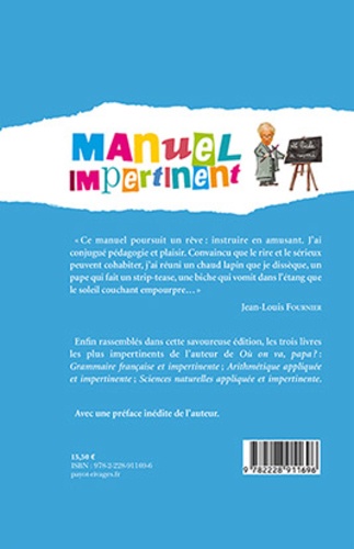Il donne souvent le mauvais exemple, mais toujours la bonne réponse. Voici un manuel impertinent qui réunit l'ensemble des connaissances et des règles à suivre pour dire et écrire correctement bêtises et grossièretés. Notamment donc le subjonctif imparfait du verbe péter, le calcul du poids exact du cerveau d'un imbécile, la reproduction vue à travers les cochonneries que font les cochons... Jean-Louis Fournier manie humour noir, sens aigu des jeux de mots absurdes, problèmes cocasses et fantaisistes, et prouve définitivement qu'on peut apprendre en s'amusant.
