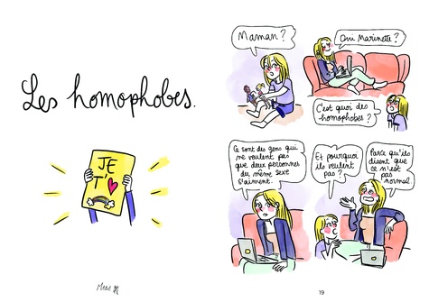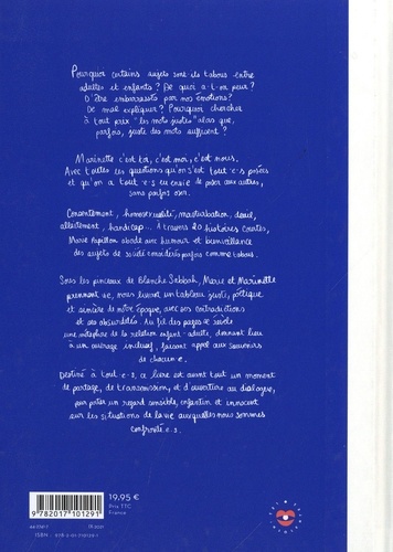 Pourquoi certains sujets sont-ils tabous entre adultes et enfants ? De quoi a-t-on peur ? D'être embarrassés par nos émotions ? De mal expliquer ? Pourquoi chercher à tout prix "les mots justes" alors que, parfois, juste des mots suffisent ? Marinette, c'est toi, c'est moi, c'est nous. Avec toutes les questions qu'on s'est tout-e-s posées et qu'on a tout-e-s eu envie de poser aux autres, sans parfois oser. Consentement, homosexualité, masturbation, deuil, allaitement, handicap... A travers 20 histoires courtes, Marie Papillon aborde avec humour et bienveillance des sujets de société considérés parfois comme tabous. Sous les pinceaux de Blanche Sabbah, Marie et Marinette prennent vie, nous livrant un tableau juste, poétique et sincère de notre époque, avec ses contradictions et ses absurdités. Au fil des pages se révèle une métaphore de la relation enfant-adulte, donnant lieu à un ouvrage inclusif, faisant appel aux souvenirs de chacun-e. Destiné à tout-e-s, ce livre est avant tout un moment de partage, de transmission, et d'ouverture au dialogue, pour porter un regard sensible, enfantin et innocent sur les situations de la vie auxquelles nous sommes confronté-e-s.