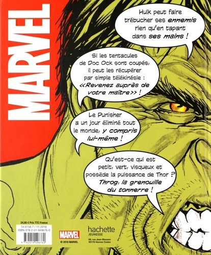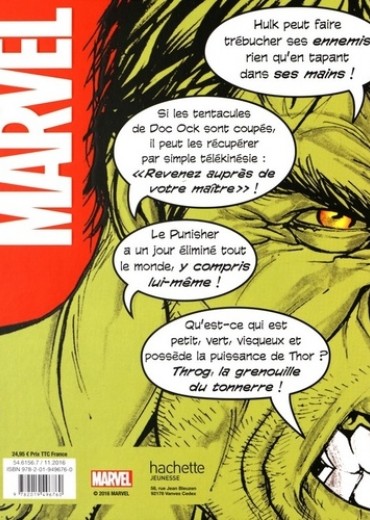 Un recueil de 240 pages qui vous dévoile des anecdotes, des récits incroyables mais vrais et des faits étranges mais intéressants sur vos personnages préférés des comics Marvel. Découvrez pourquoi Hulk apparaît de trois couleurs différentes (vert, gris et rouge) ou encore comment une grenouille a acquis une fois les pouvoirs de Thor ! Ce guide unique ravira et surprendra tous les fans en dévoilant les secrets de super héros mais aussi les coulisses de certaines scènes de comics.